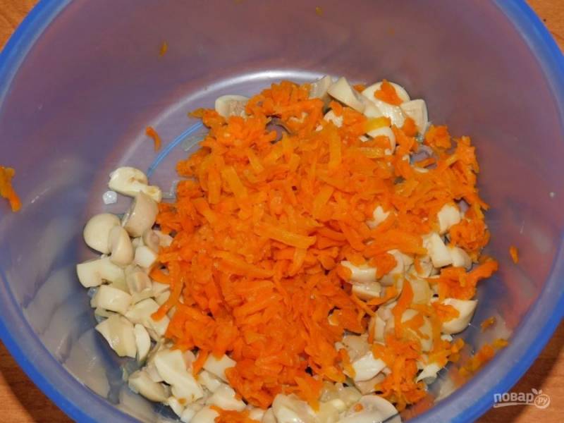 Добавьте к грибами отварную морковь, натертую на крупной терке.