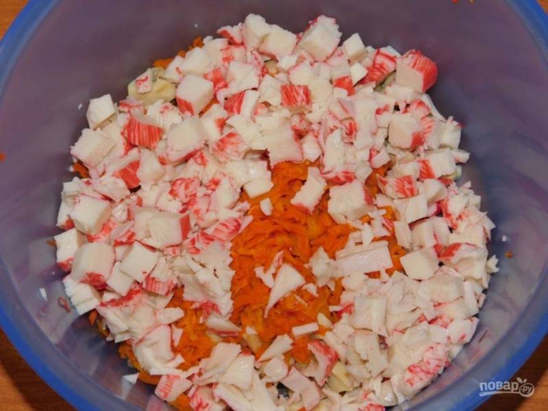 Крабовые палочки нарежьте и немного обжарьте. Их тоже добавьте в салат.