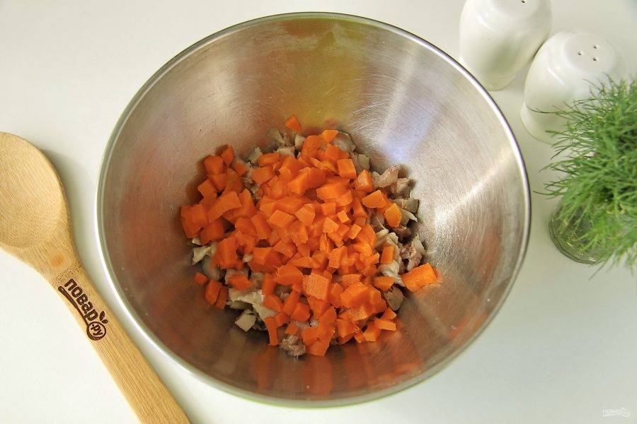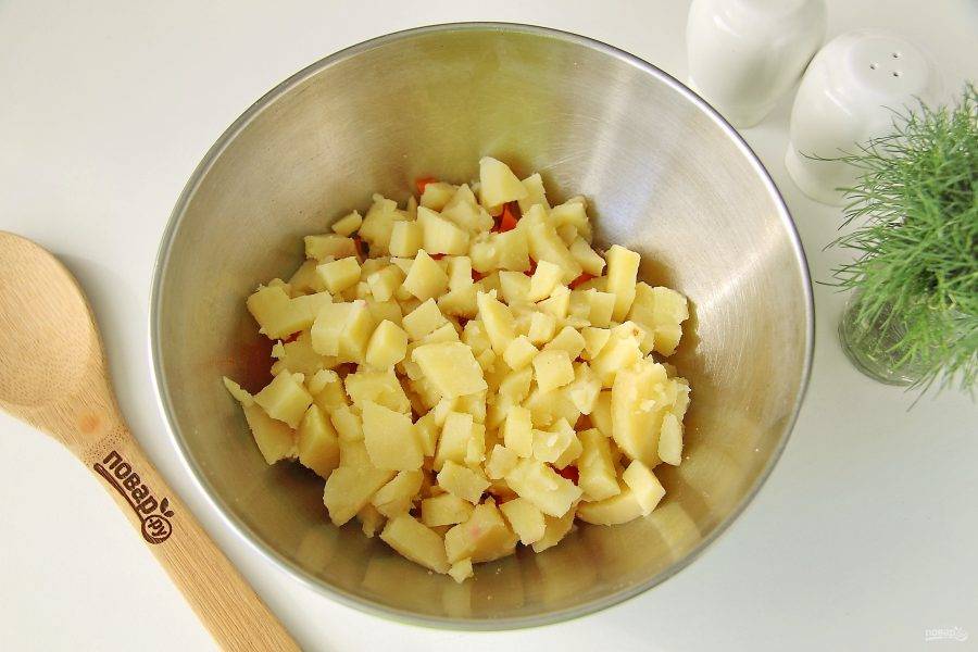 Сельдь разделайте на филе, затем нарежьте небольшими кубиками. Затем примерно такими же кубиками нарежьте овощи.
