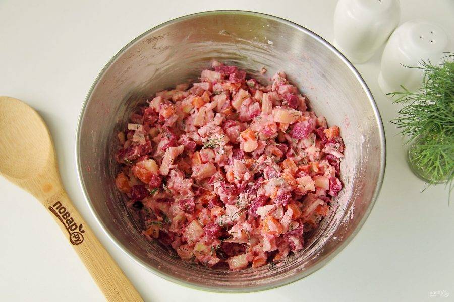 Добавьте к нарезанным ингредиентам майонез, зелень и соль по вкусу.