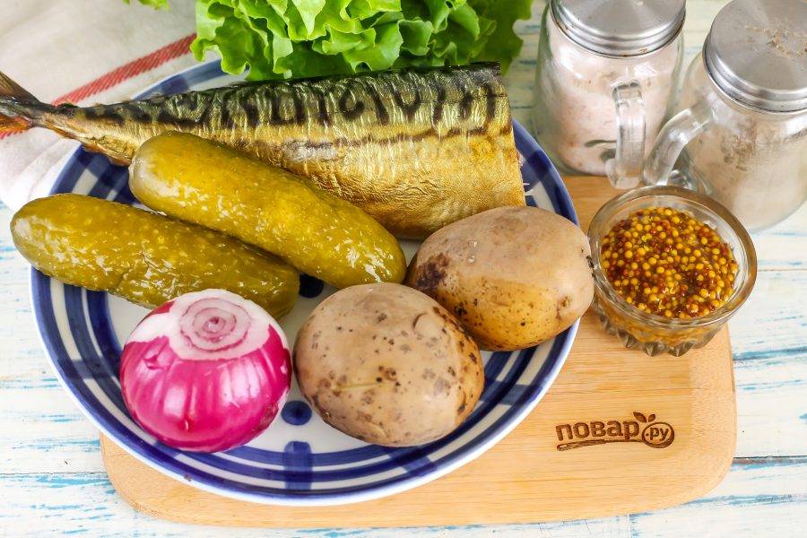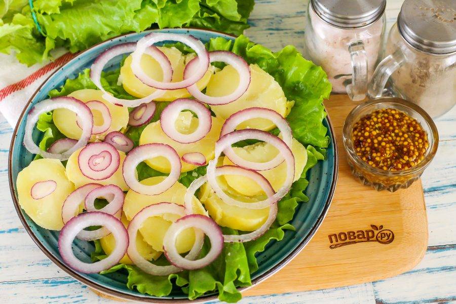 Подготовьте указанные ингредиенты. Картофель отварите заранее до готовности. Лук по желанию можете замариновать в яблочном уксусе.