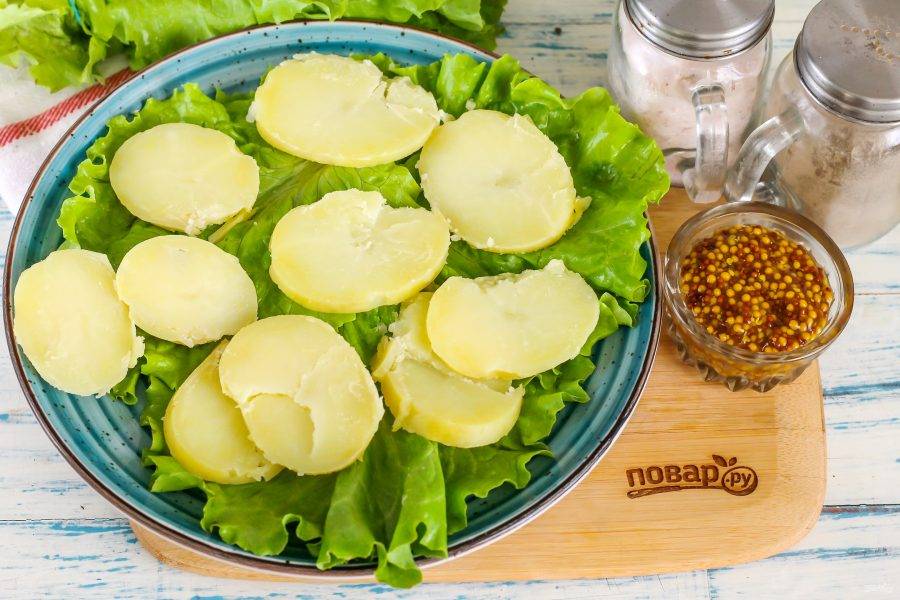 Промойте листья салата, обсушите их бумажным полотенцем и выложите на тарелку. Очистите отварные картофелины от кожуры, промойте в воде. Нарежьте кружочками и выложите на зелень.