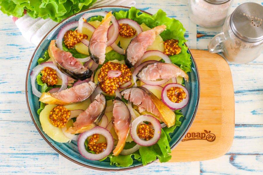 Нарежьте копченую скумбрию или другую рыбку ломтиками, удалите из них все косточки и хребет. Выложите на слой лука.