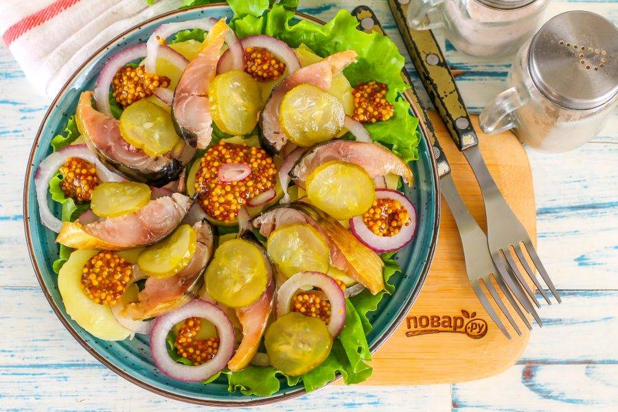 Нарежьте соленые огурцы ломтиками и выложите между остальных продуктов на тарелке. Подайте салат к столу сразу.