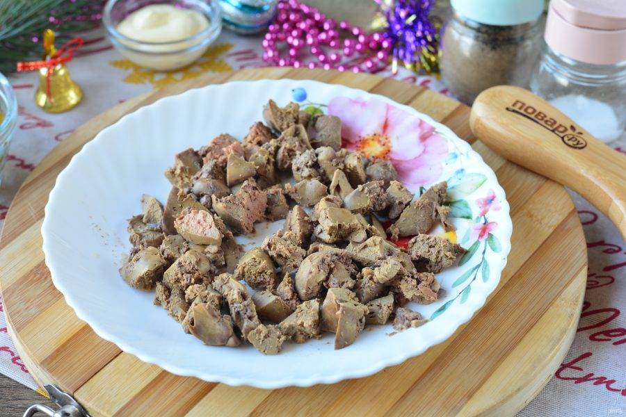 Отварите куриную печень в течение 10-12 минут, посолите. Затем слейте воду, печень остудите и нарежьте средними кусочками.