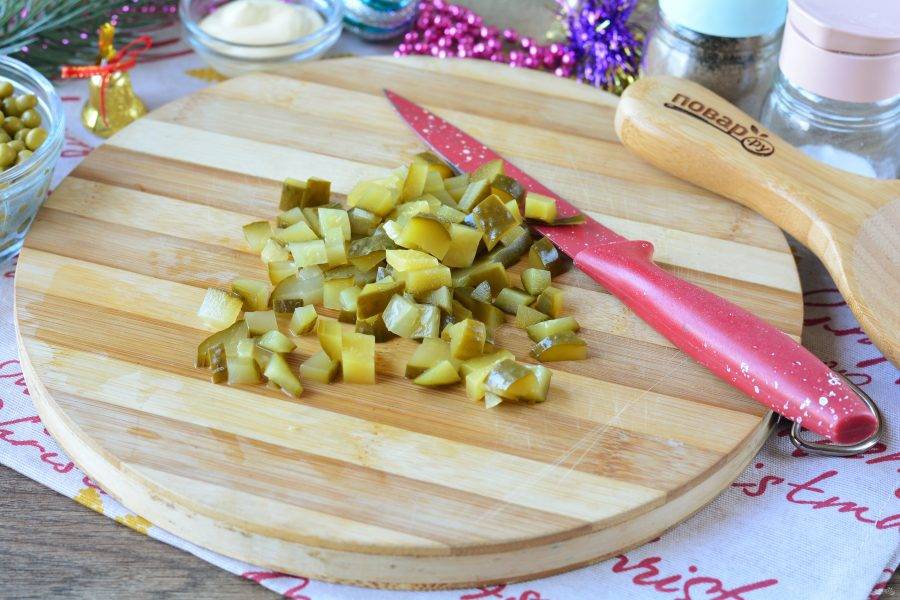 Отварите морковь, почистите и нарежьте кубиками. Всыпьте в салат.