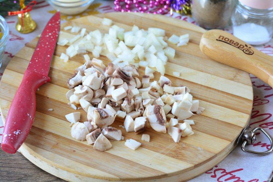 Почистите грибы и лук. Нарежьте продукты кубиками.