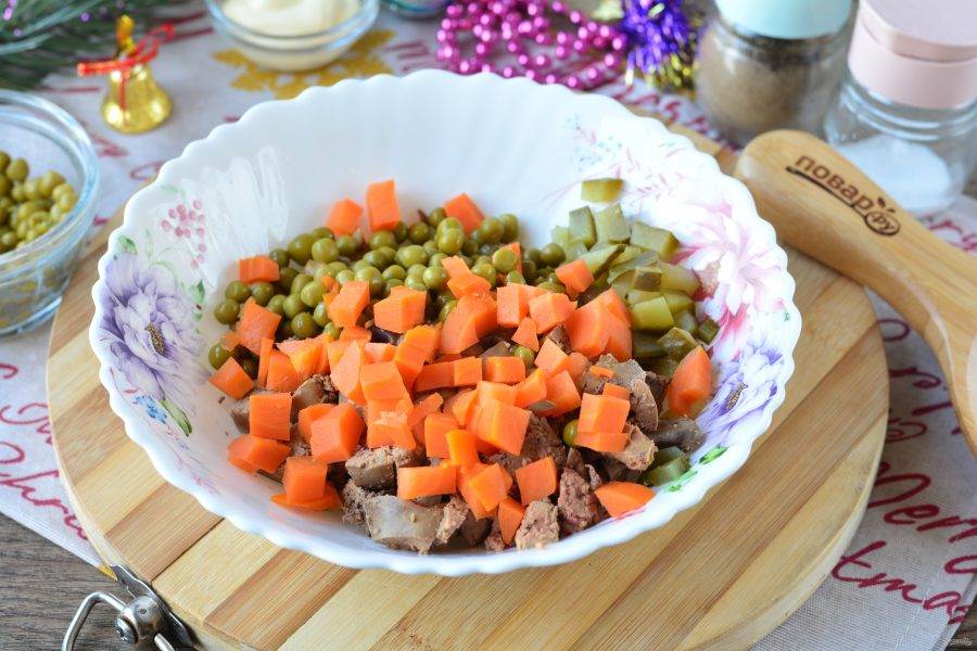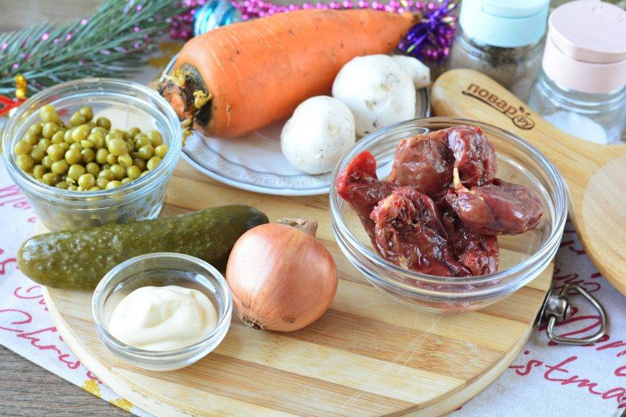 К празднику приготовьте сытный и вкусный салат с добавлением куриной печени, горошка, отварной морковки, жареных грибов и соленых огурцов. Салат украсит ваше застолье.
