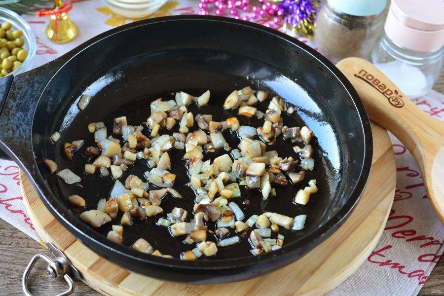 С добавлением небольшого количества растительного масла обжарьте грибы с луком в течение 4-5 минут. Посолите и поперчите по вкусу.