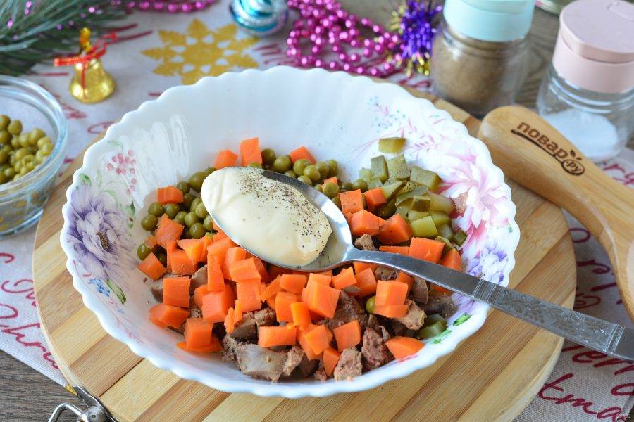 Заправьте майонезом, добавьте по вкусу соль и черный перец. Готово.