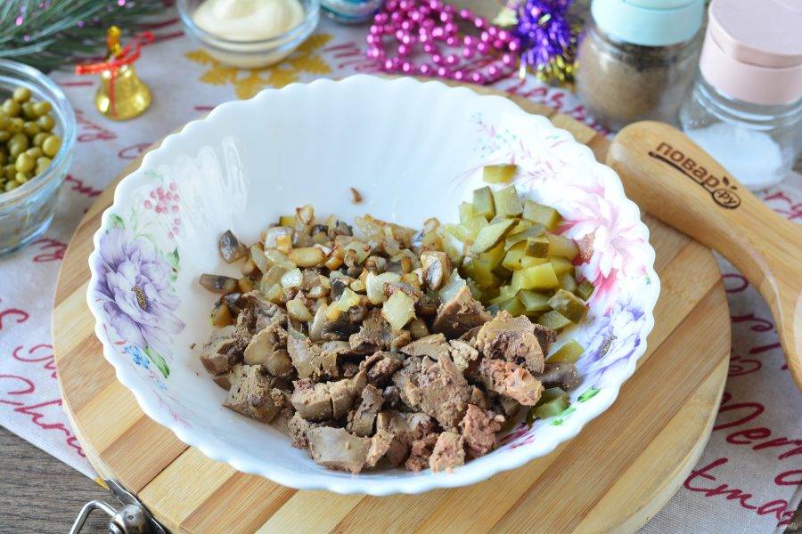 Выложите в миску печень, соленые огурцы и жареные грибы с луком.