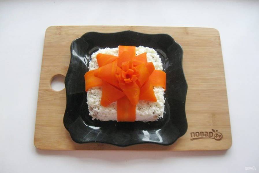 В преддверии новогоднего праздника я предлагаю вариант украшения салата в виде подарка. Такое блюдо обязательно произведет эффект на гостей.