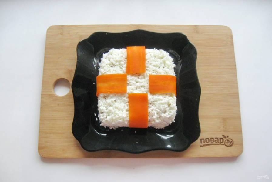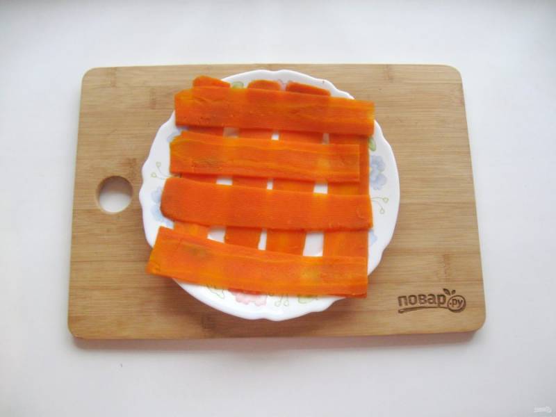 Достаточно крупную морковь отварите, охладите и нарежьте полосками. Понадобится 10-12 полосок.