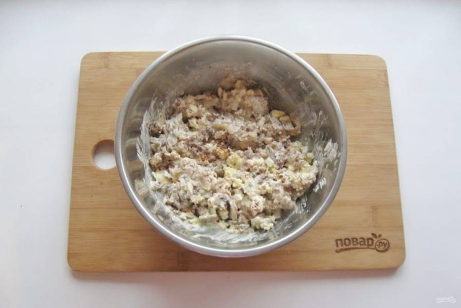 Заправьте салат майонезом и поперчите по вкусу.
