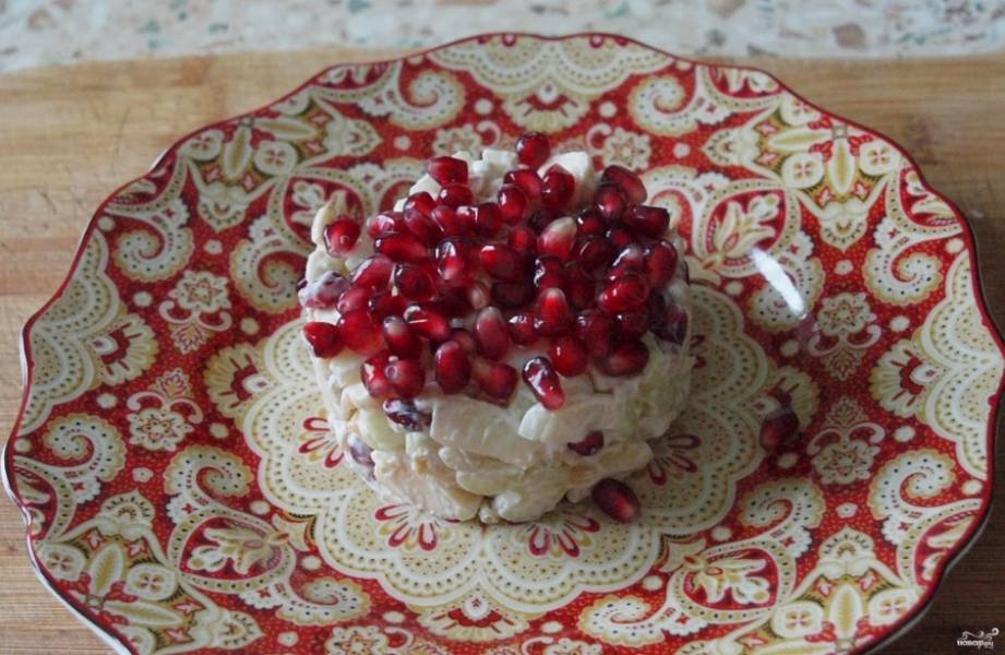 Выкладываем аккуратно салат по тарелкам порционно и украшаем оставшимися зернами граната. Салат "Новогодняя фантазия" готов. Приятного аппетита!