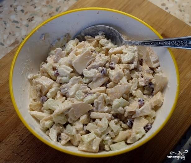Заправьте салат майонезом и сметаной. Дайте ему настояться минут 10-15. Затем добавьте специй по вкусу.