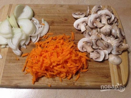 Очистим лук и морковь, тщательно промоем и очистим грибы. А затем нарезаем грибы, как вам нравится: хоть пластинками, хоть кубиками. Натираем морковь на крупной терке, а лук нарежем полу- или четвертькольцами.