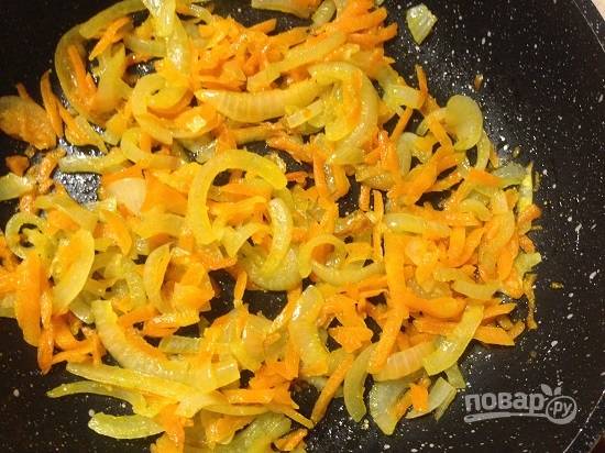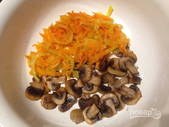 Грибы убираем со сковороды, добавляем еще немного масла и обжариваем лук и морковь до мягкости. В процессе обжарки можно слегка посолить и поперчить.
