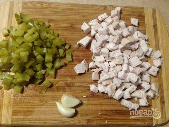 А пока можно нарезать кубиками отваренную заранее куриную грудку и соленые или маринованные огурчики. Очистим чеснок.