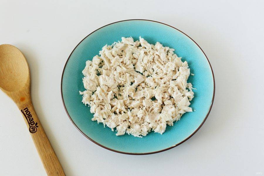 Салат можно выложить при помощи кулинарного кольца, в глубокий салатник или просто на подходящую по размеру плоскую тарелку. Первым слоем выложите нарезанную куриную грудку.