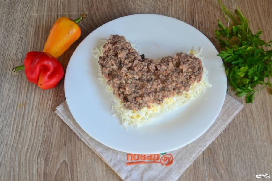 Следующий слой – сардина. Ее выложите ровным слоем по всей поверхности нашей основы. Если нужно, присолите и поперчите.