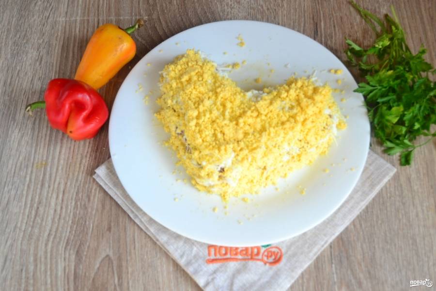 Покройте майонезом, выложите оставшиеся белки и снова смажьте майонезом.
