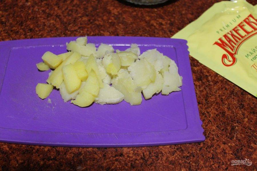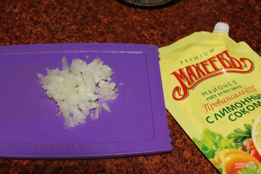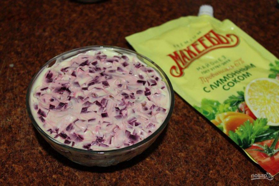 В салатник выложить слоями: огурцы, лук, картофель. Каждый слой промазать майонезом.