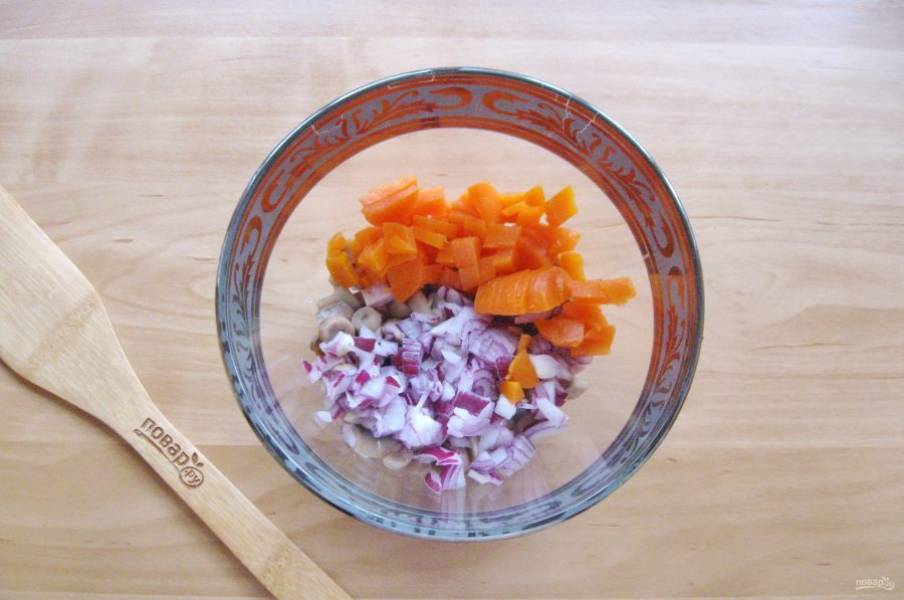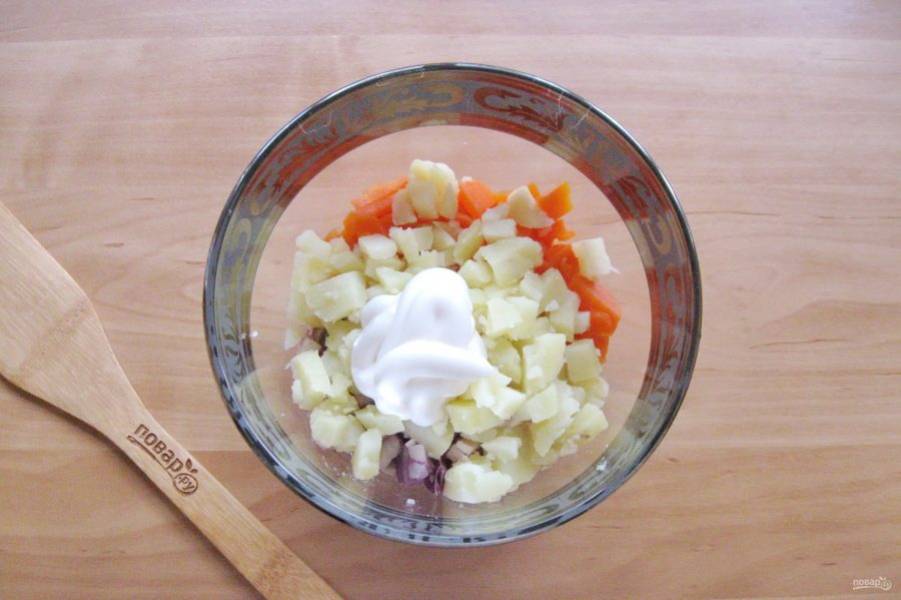 Морковь отварите, охладите, очистите и нарежьте кубиками.