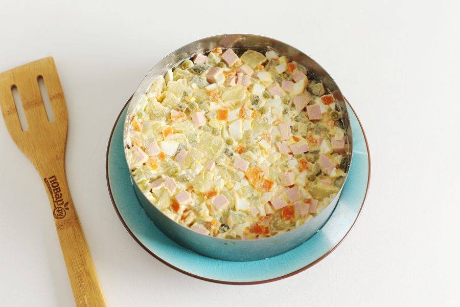 Используя кулинарное кольцо выложите салат на плоскую круглую тарелку подходящего диаметра. Украшаем салат непосредственно перед подачей.