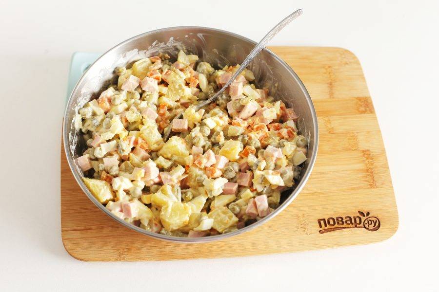 Заправьте салат майонезом, добавьте соль по вкусу и все хорошо перемешайте.