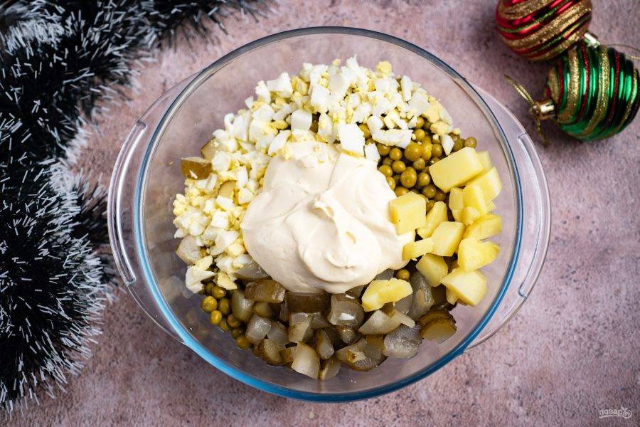 К ним добавьте кубики соленых огурцов и измельченные яйца.