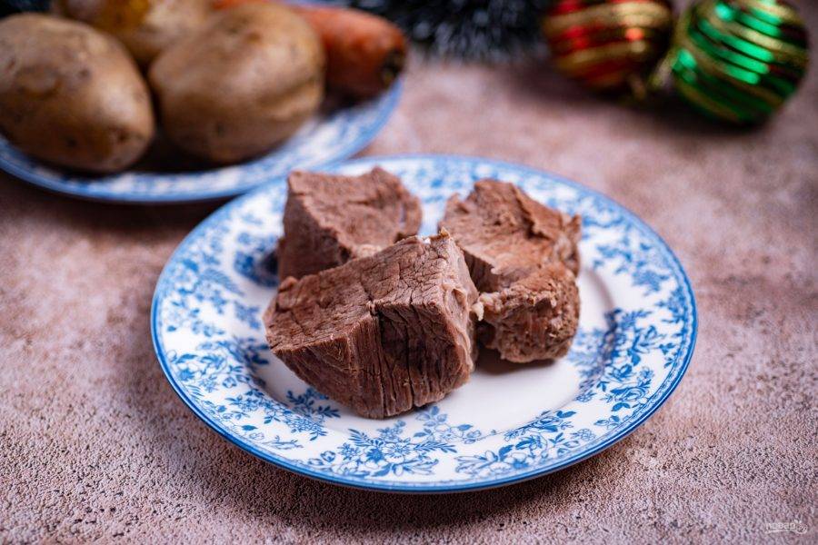 Отварную говядину нарежьте небольшими кусочками.