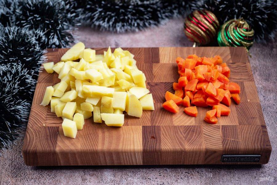 Почистите отварные картофель и морковь. Нарежьте овощи небольшими кубиками.