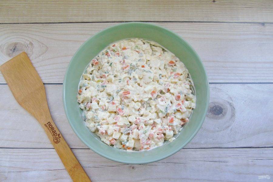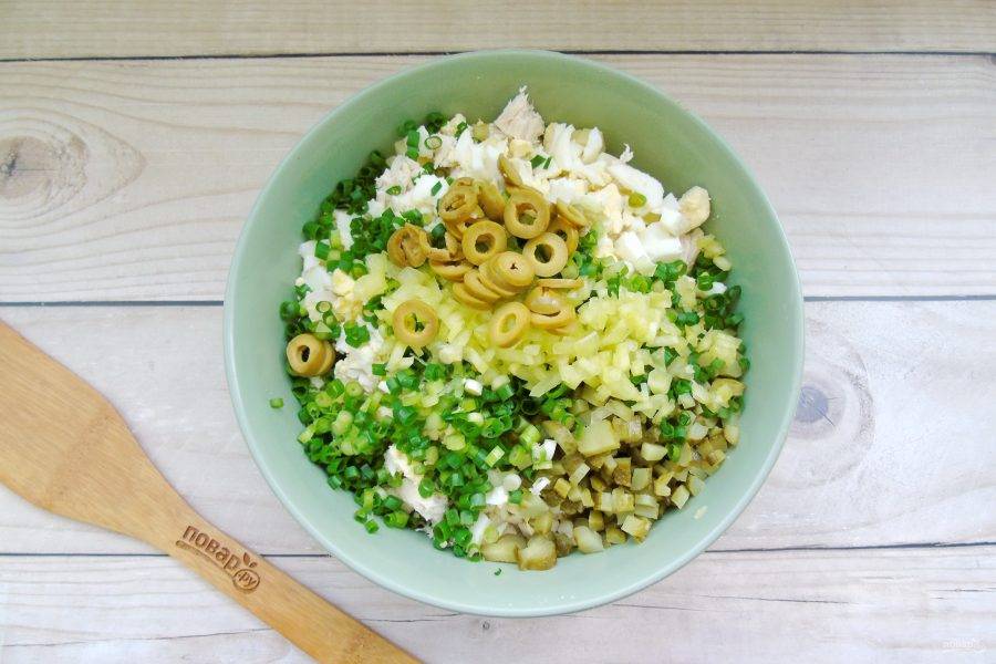 Салат "Оливье" с курицей, сладким перцем и оливками