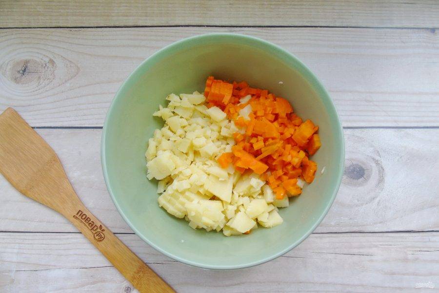 Картофель и морковь отварите в кожуре, охладите и очистите. Нарежьте небольшими кубиками и выложите в миску.