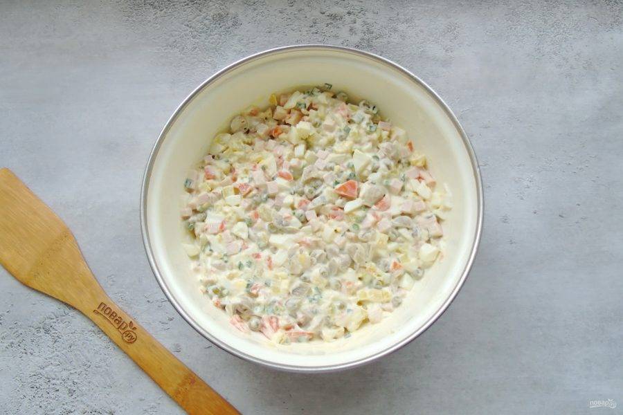 Салат "Оливье" с маринованными грибами готов. Подавайте на закуску.
