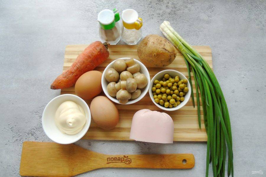 Возьмите ингредиенты для приготовления салата "Оливье".