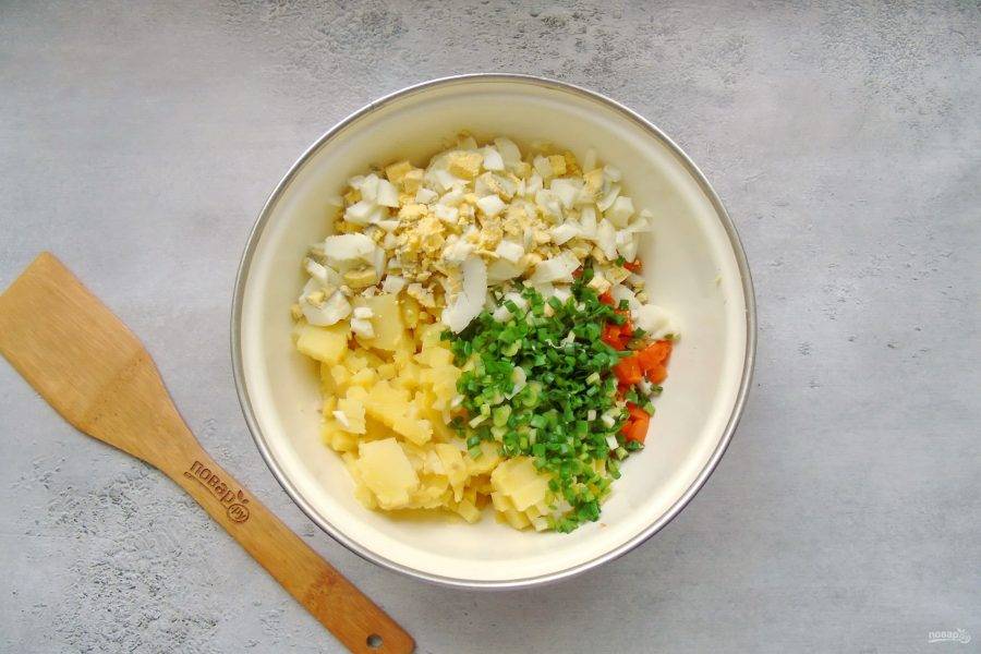 Картошку и морковь отварите в кожуре, охладите, очистите и нарежьте мелкими кубиками.