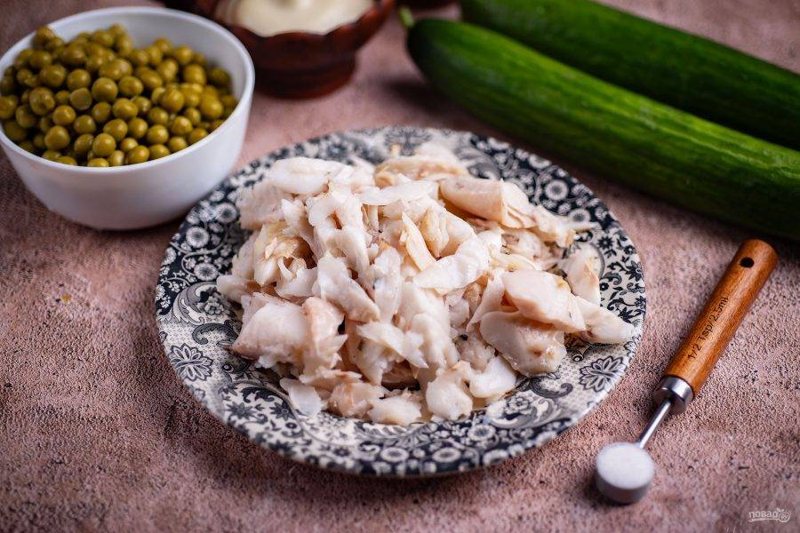 После чего снимите с костей рыбную мякоть, удаляя пинцетом более мелкие косточки. Разберите или нарежьте рыбное мясо на мелкие кусочки.