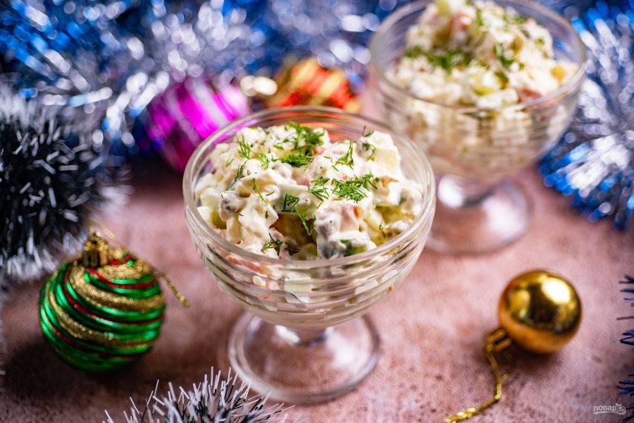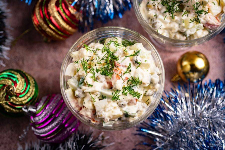 Затем готовый салат «Оливье» разложите по порционным креманкам, украсьте по своему вкусу (я чуть присыпала свежим, мелко порубленным укропом), подавайте к столу.