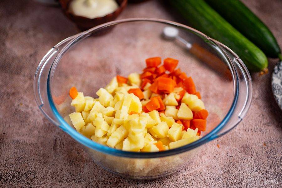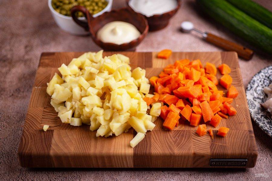 Уже отваренные и охлажденные картофель и морковь почистите от кожуры и нарежьте небольшими кубиками.