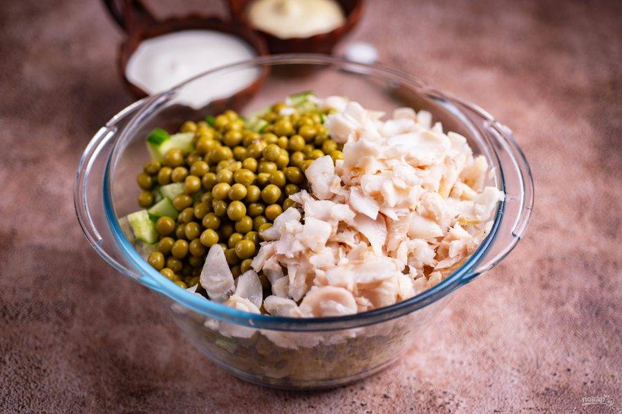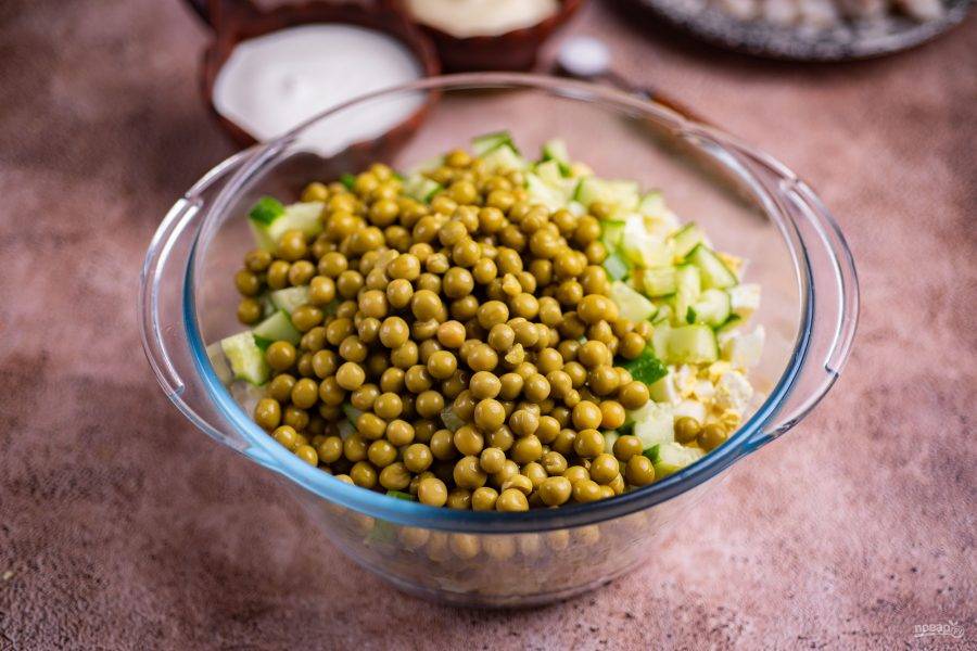 Нарезанные огурцы и яйца добавьте в миску к остальным овощам. Туда же добавьте горошек.