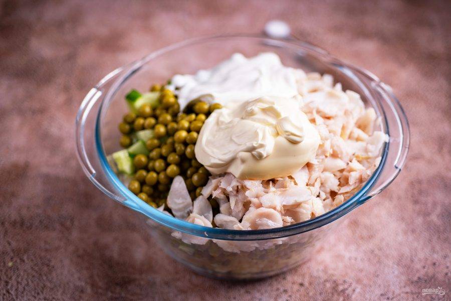 Добавьте майонез и сметану, черный молотый перец и соль. Перемешайте все ложкой. Салат в миске отправьте в холодильник на часик, чтобы все пропиталось.