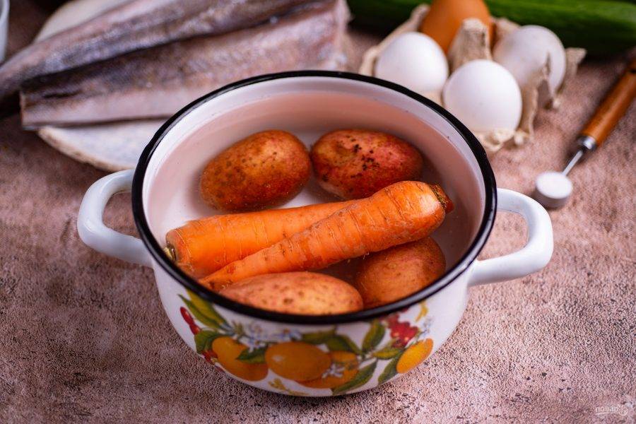 В кастрюле с водой отварите «в мундирах» морковь и картофель до готовности.