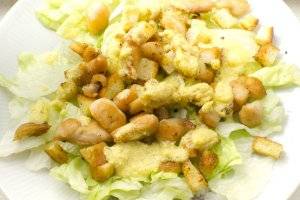 2. Листья салата моем, немного обсушим, выкладываем на дно салатницы. Можно порвать руками, можно оставить листики целыми. Затем сверху выкладываем сухарики и курицу.