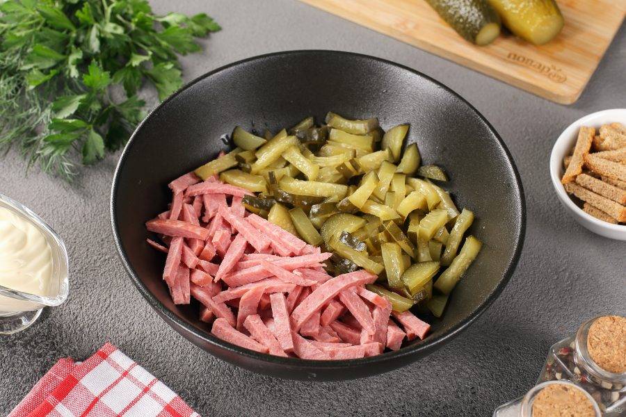 Колбасу и огурцы нарежьте соломкой.