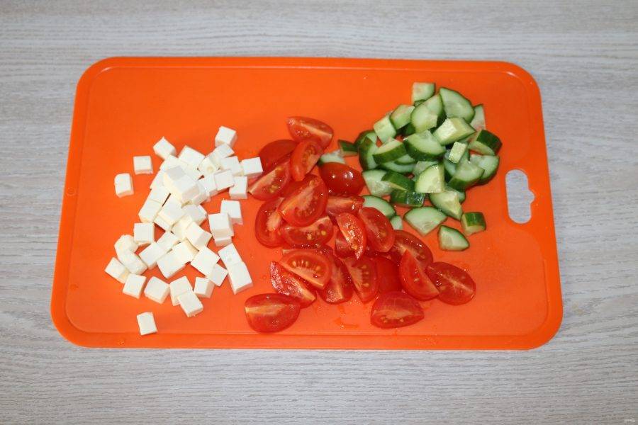 Сыр нарежьте кубиками, помидоры и огурцы четвертинками.