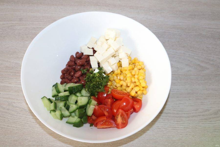 В салатнике соедените помидоры, огурцы, мелко нарезанную зелень, лук, фасоль и кукурузу.