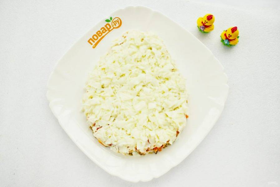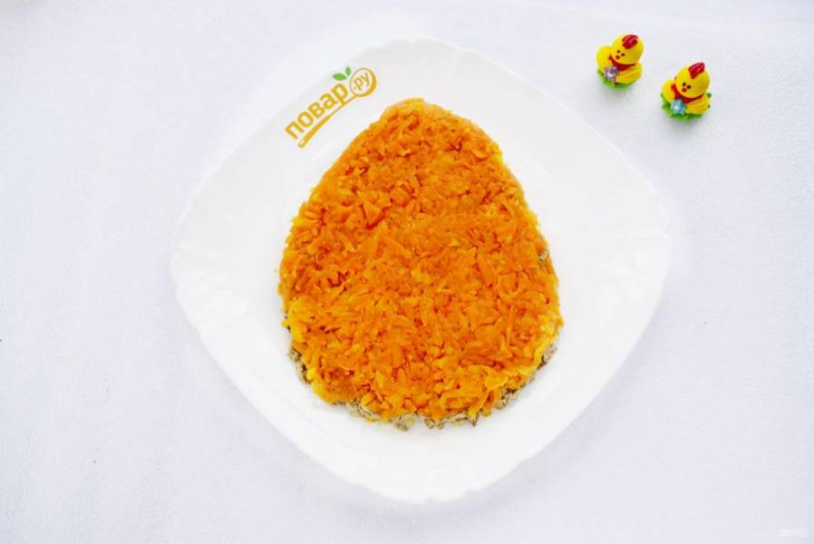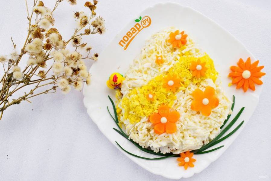 4-й слой — тертый плавленый сырок. Сверху сделайте полоску из тертого желтка и украсьте цветами из моркови. Снизу "яйца" разместите перья зеленого лука.
