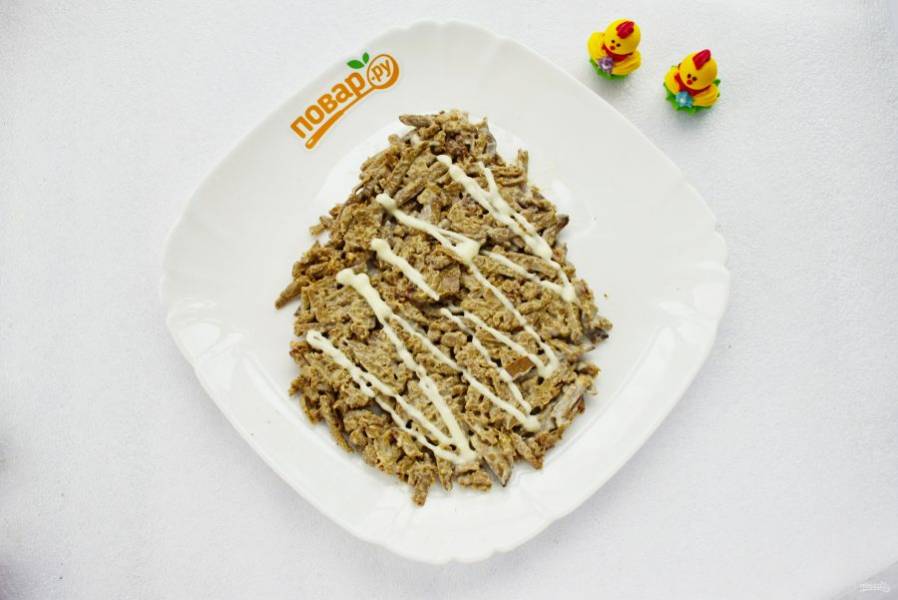 Начнем выкладывать салат слоями в форме яйца. Первый слой: натертую печень перемешайте с 2 ст. л. майонеза, разместите на блюде для подачи, сделайте сетку из майонеза.